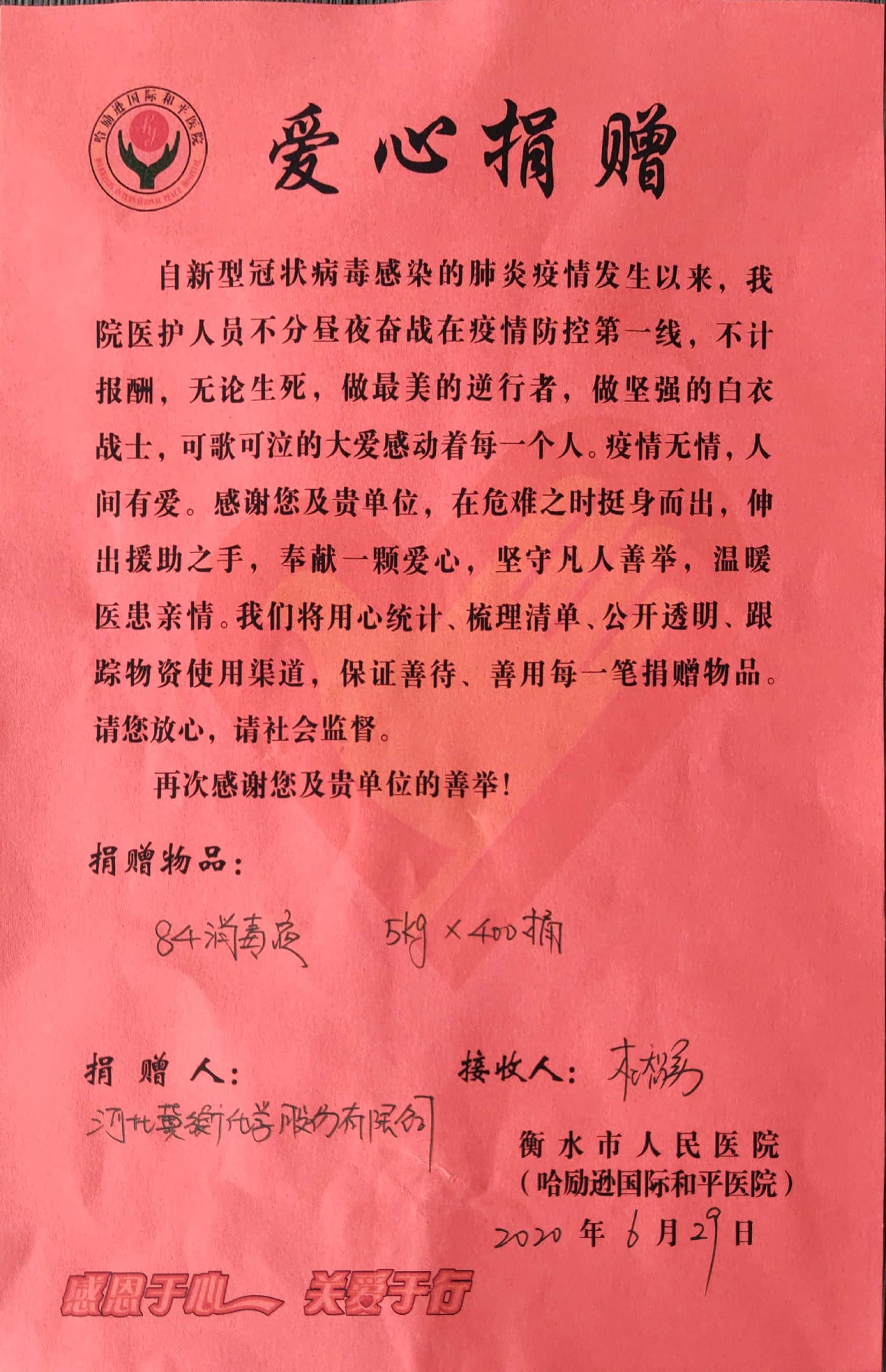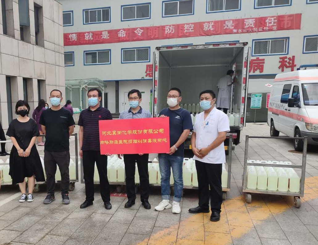 6月29日上午,公司宋英健副總經理一行來到衡水市人民醫院,代表我公司向人民醫院捐贈84消毒液兩噸,人民醫院有關領導接受了捐贈,并對我公司表示感謝。宋總表示,作為河北省防疫物資重點生產企業,我公司將繼續關注疫情發展,繼續助力疫情防控,相信在全社會的共同努力下,我們一定能夠戰勝病毒,取得新冠病毒疫情阻擊戰的勝利。